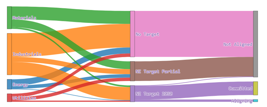 Deeper analysis into companies with regards to interim GHG reduction targets, emissions disclosure, and decarbonization strategy indicates that only 3% of companies are Aligning and 16% of companies are Committed to Aligning. Sankey graphs (Figure 2) show the flow of companies between Net Zero targets and Net Zero Alignment status.