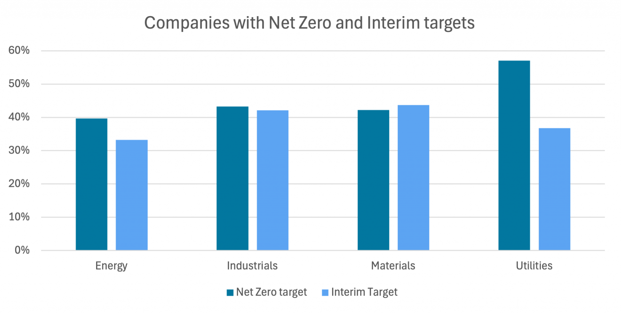 A similar trend is observed in the Industrials and Materials sectors, with 43% of industrial companies and 42% of materials companies expressing ambitions to reach Net Zero. Further, 42% of industrials companies and 44% of materials companies have set interim targets.