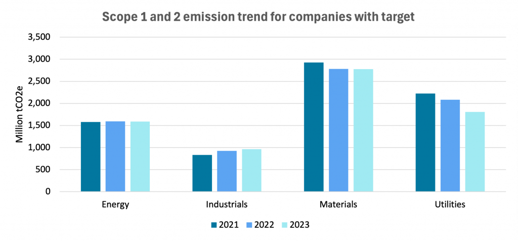 An evaluation was conducted to analyze Scope 1 and 2 emissions trends across four hard-to-abate sectors. The evaluation’s focus was on companies that consistently reported emissions data for the years 2021 to 2023 and have set either Net Zero, interim, or both types of emission reduction targets.