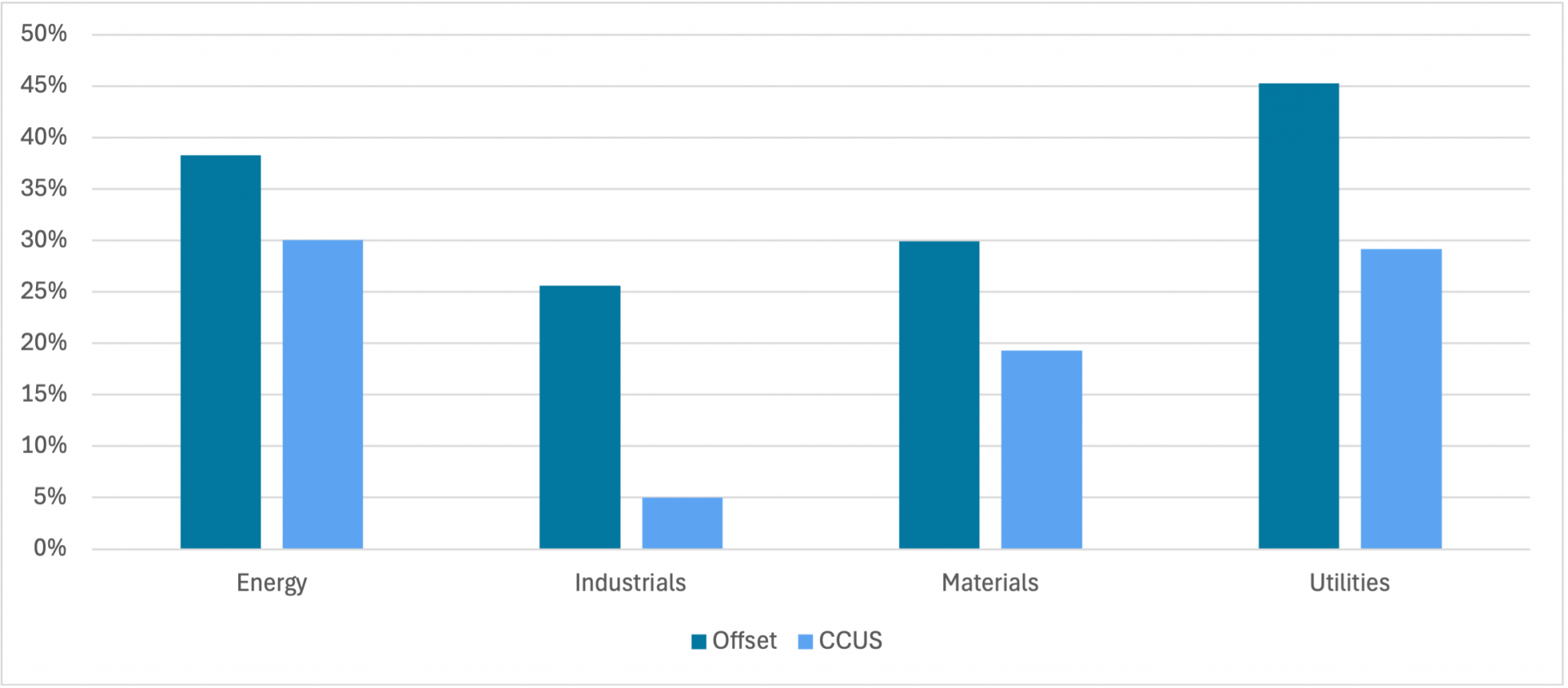 The Utilities sector demonstrates the highest level of commitment, with 62% of companies setting Net Zero or interim targets. Among all companies within the Utilities sector, 45% of companies plan to use offsets, and 29% plan to use CCUS to achieve their goals.