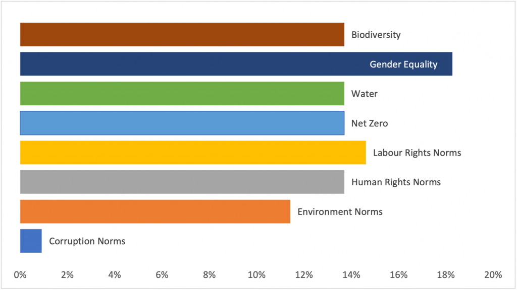 Among Social topics, most of the engagements focused on Gender Equality, followed closely by Labour Rights Norms under Norm-Based Engagement. Within Labour Rights Norms, the most frequently discussed issues were workplace health and safety, as well as forced labour. In the area of Human Rights Norms, the most common sub-topics included controversies related to indigenous rights, living standards, and inadequate stakeholder consultation.