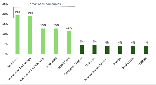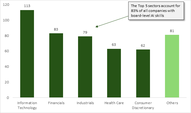 Like board oversight, AI technical skills are highly concentrated within a narrow subset of industries. Of the 3,048 companies reviewed, only 481 organizations (16%) disclosed the presence of at least one director with specialized AI skills. Within these companies, five sectors account for 83% of all AI-skilled boards, suggesting that governance maturity is siloed in industries where AI is viewed as a primary operational driver (Figure 2).