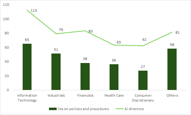 Within the five leading sectors, the presence of AI policies and procedures is positively correlated with the presence of board members with AI skills. Nevertheless, a striking “readiness gap” exists within the leading sectors, indicating that the presence of an AI-skilled director does not inherently guarantee the existence of formal corporate policies (Figure 3).