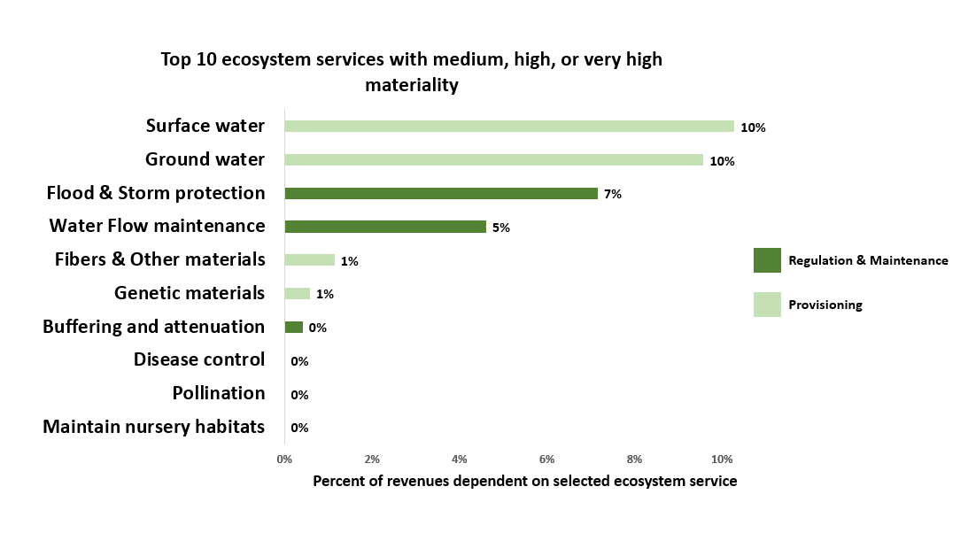 When looking at overall ecosystem service materiality for the portfolio, surface and ground water have the greatest revenue dependency (Figure 2).