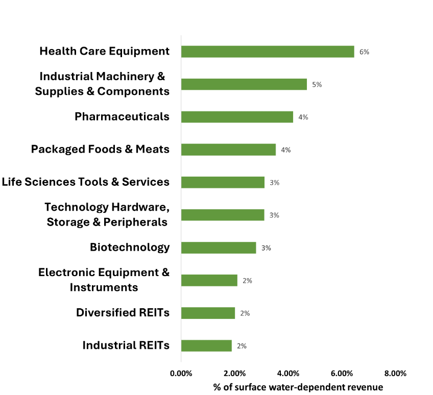 A significant percentage of surface water revenue dependencies (distinguished by GICS sub-industry classification) originate from Health Care Equipment, Industrial Machinery, and Pharmaceuticals.