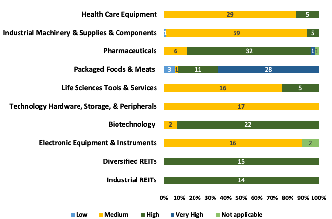 Pharmaceuticals, Packaged Foods & Meats, and Diversified & Industrial REITs are the industries with a high to very high materiality of surface water (Figure 4). With these materiality levels considered, these industries combined account for a higher surface water-related revenue than Health Care Equipment alone.