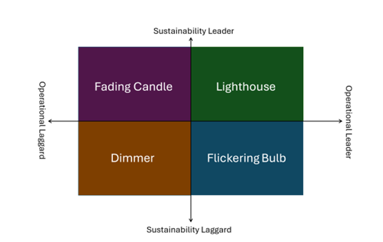 - Companies in the bottom-right quadrant, the Flickering Bulbs (Sustainability Laggards/Operational Leaders) have sustainability practices that are below the industry standard but deliver strong operational metrics. They have this profile likely because of cyclical factors, which raises the question of the persistence of their operational strength.