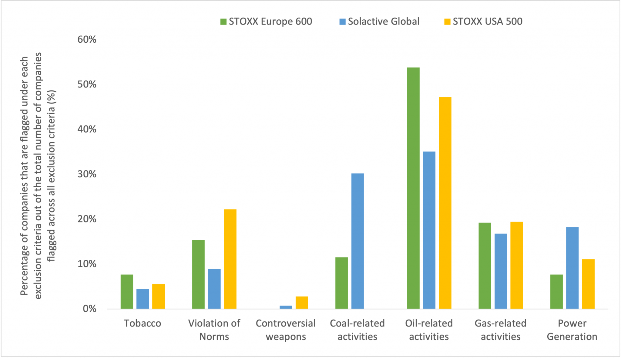 For the Solactive Global index, 268 companies, out of a pool of 3,305 companies, are flagged under the PAB exclusion criteria. Similar to the STOXX Europe 600 index, 77% of these exclusions are caused by involvement in fossil fuel-related activities. Ninety-four companies exceed the threshold for involvement in oil-related activities, while 81 companies exceed the coal exclusionary threshold and 31 exceed the gas threshold.