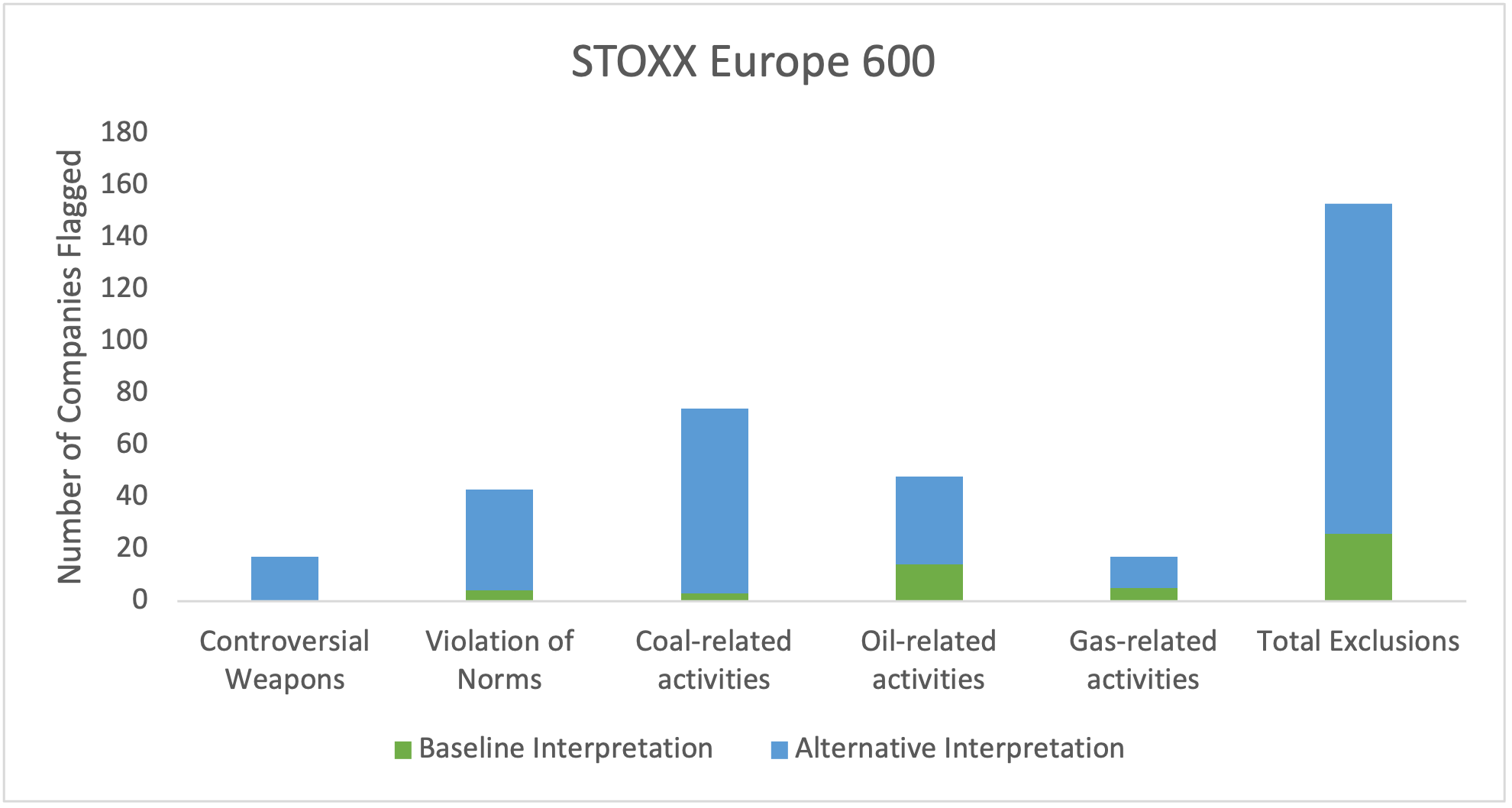Figure 3: Exclusions from Applying Baseline vs Stricter Alternative Interpretation of Exclusion Criteria to STOXX Europe 600 Index
