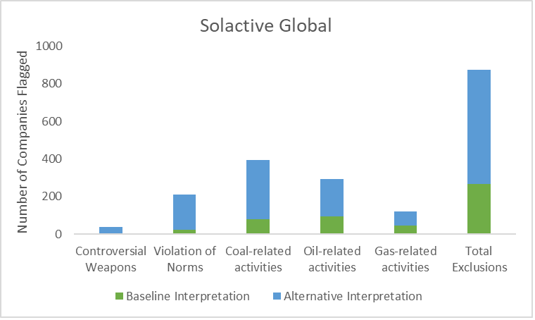 Figure 4: Exclusions from Applying Baseline vs Stricter Alternative Interpretation of Exclusion Criteria to Solactive Global Index