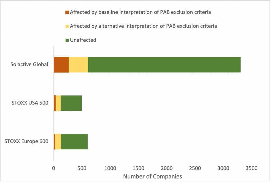 Overall, when applying baseline interpretations across not only fossil-fuel related exclusions but all exclusion criteria, non-ESG-tilt indices such as STOXX Europe 600 and Solactive Global Index have 4.3% and 8.1% of their constituents, respectively, which are not aligned with the PAB exclusion criteria. However, the number jumps to 21.6% and 18.3%, respectively, with the stricter interpretation. This difference might be relevant for index-tracking funds, as a stricter interpretation would help them both to have broader perspectives on their holdings and to meet their mandates over time.