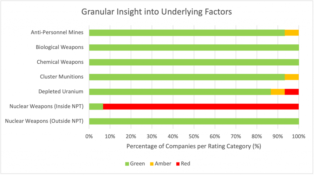 Users can also easily understand in more granular detail which controversial weapon involvement has caused the exclusion and can make any adjustments to the exclusion as desired. For instance, in the case illustrated in Figure 6, 1 issuer out of the 15 has a red flag (per ISS ESG’s Norm-Based Research solution) for involvement in a depleted uranium program and can thus be included within the investment portfolio if desired.