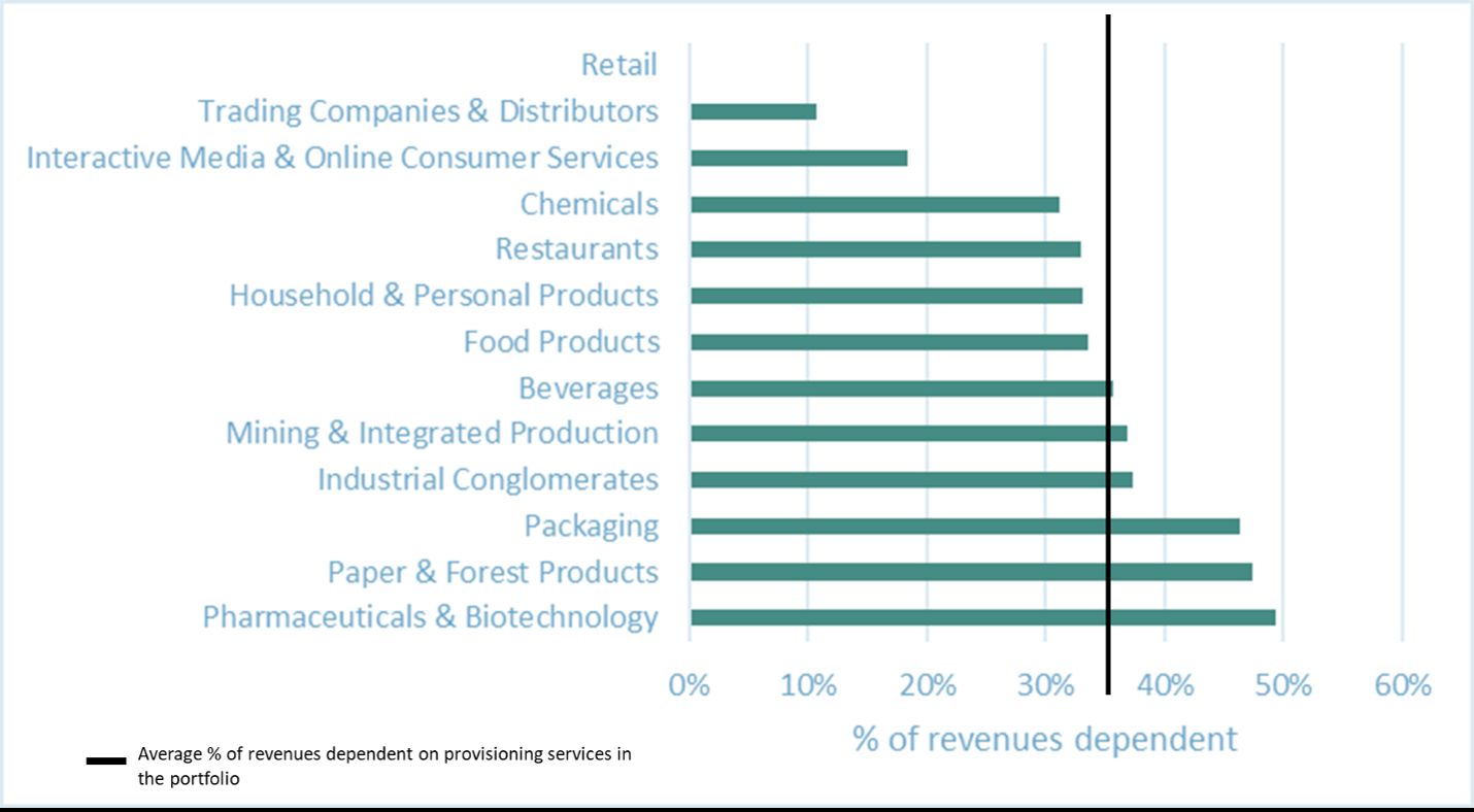 Looking at provisioning services alone, the industries most exposed include Pharmaceuticals & Biotechnology, Paper & Forest Products, and Packaging.