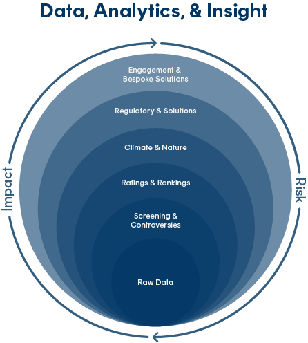 We offer a comprehensive suite of sustainability solutions, including raw data, ratings, screening tools, climate and nature analytics, and engagement services. Our offerings help financial institutions understand, measure, and act on sustainability-related risks across all asset classes. Through this comprehensive solution set, we enable clients to identify material risks and opportunities while meeting global regulatory and reporting requirements with confidence.